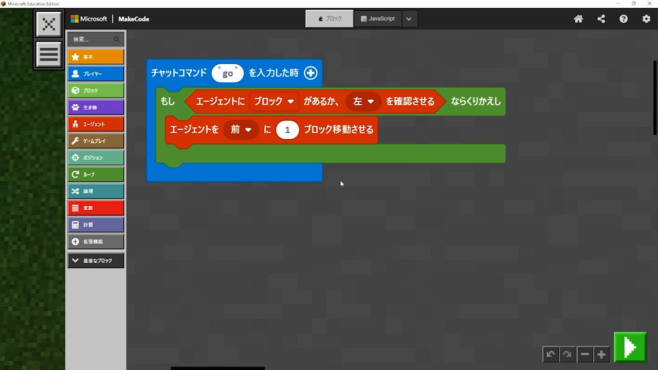 13-1 洋館への道 公開済み: 2022年10月8日更新: 2024年8月23日作成者: edmonstaff_admin 俯瞰図 解説動画 訂正 解答画像 解答コード player.onChat("13-1", function () { while (agent.detect(AgentDetection.Block, LEFT)) { agent.move(FORWARD, 1) } }) 教え方のポイント 道一本一本ごとにどこに穴があってどっち方向に行きたいかを確認し一本ずつゆっくり作らせる。 よくある間違い エージェントに確認させる方向が間違っている 進む方向が間違っている 次の記事へ13-2 深い森の入り口