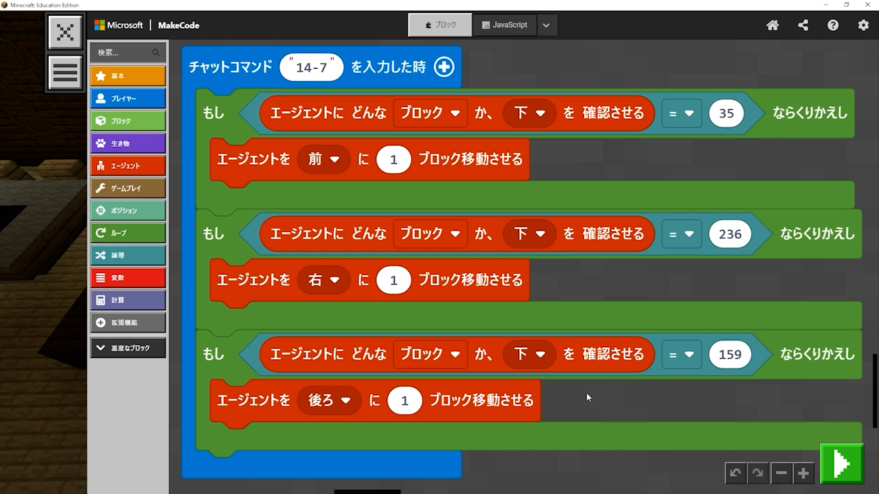 - 「エージェントにどんなブロックか下を確認させる」を入れないといけないのに、「エージェントにブロックがあるか下を確認させる」というプログラムを入れてしまっている。