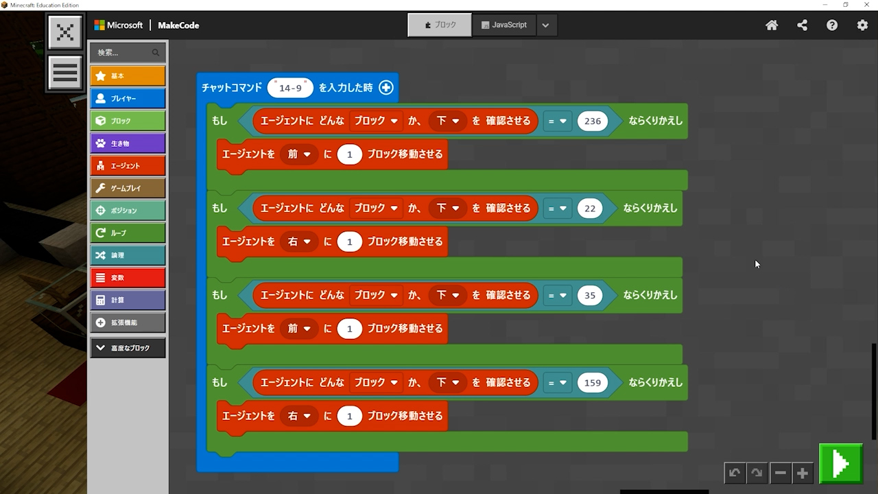 - 「エージェントにどんなブロックか下を確認させる」を入れないといけないのに、「エージェントにブロックがあるか下を確認させる」というプログラムを入れてしまっている。