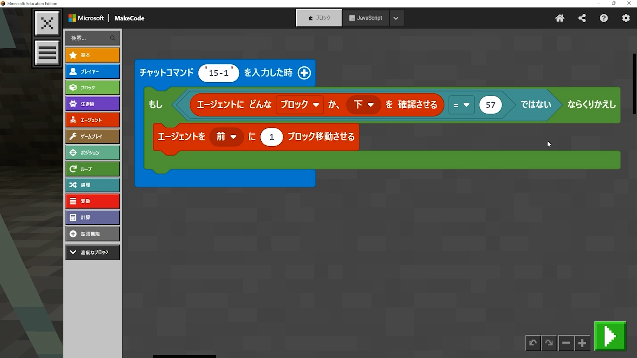 - 「エージェントにどんなブロックか下を確認させる」を入れないといけないのに、「エージェントにブロックがあるか下を確認させる」というプログラムを入れてしまっている。