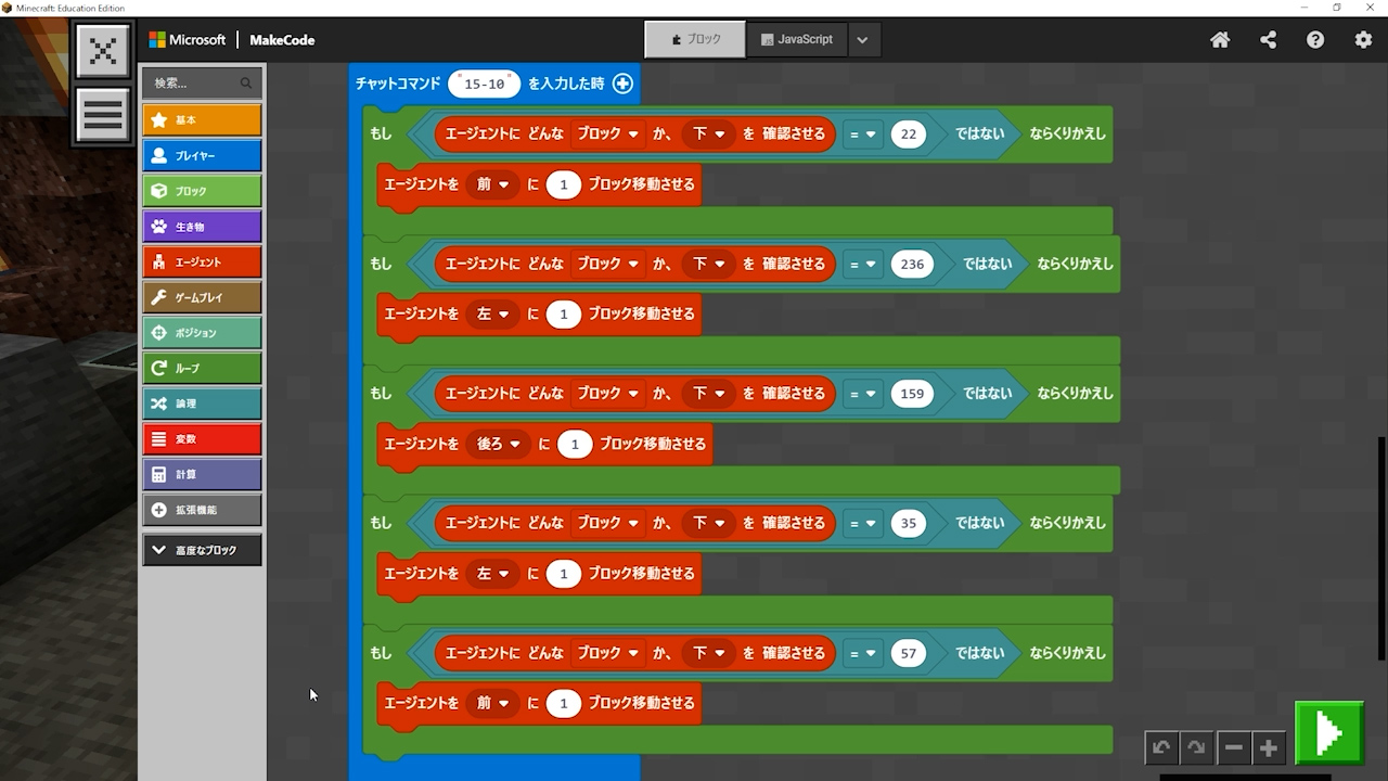 - 「エージェントにどんなブロックか下を確認させる」を入れないといけないのに、「エージェントにブロックがあるか下を確認させる」というプログラムを入れてしまっている。