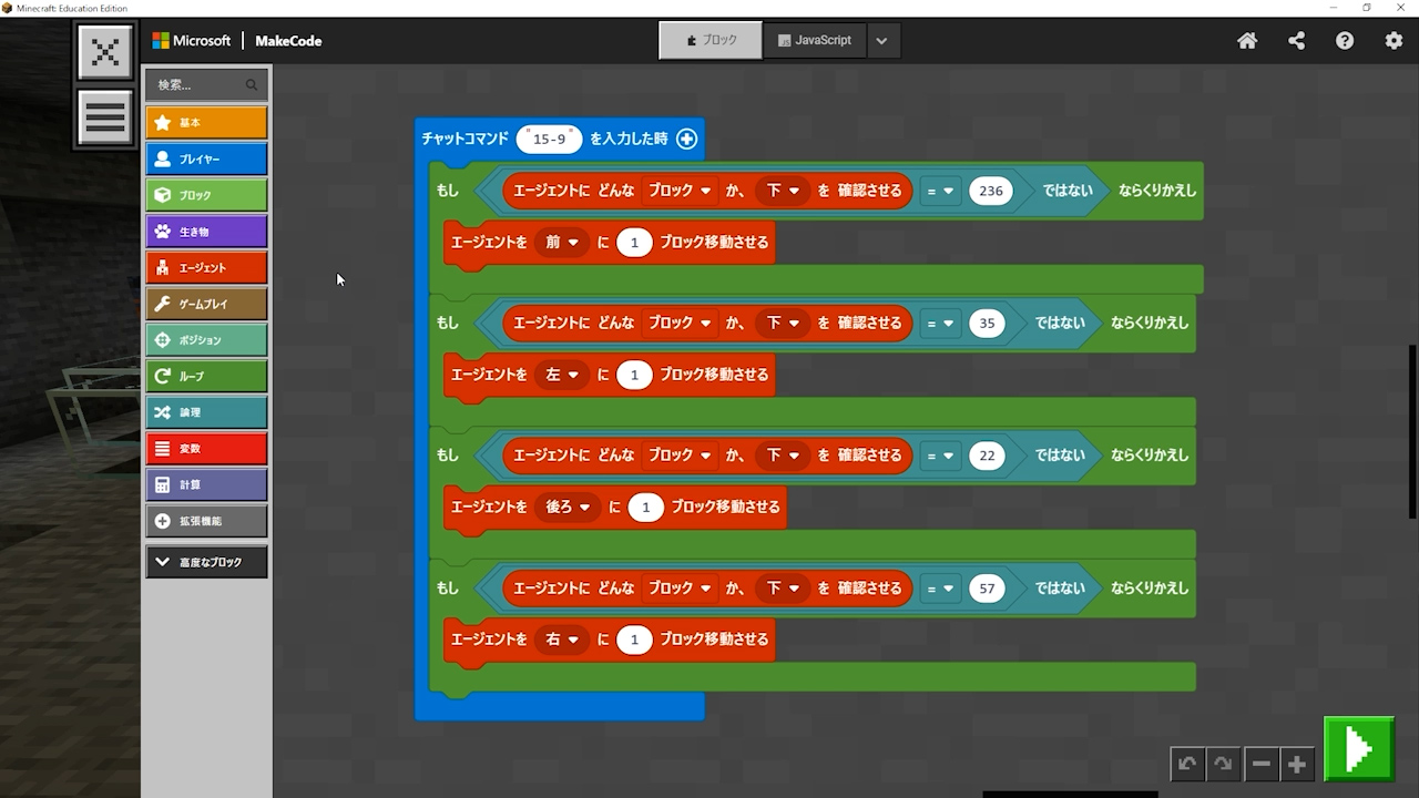 - 「エージェントにどんなブロックか下を確認させる」を入れないといけないのに、「エージェントにブロックがあるか下を確認させる」というプログラムを入れてしまっている。