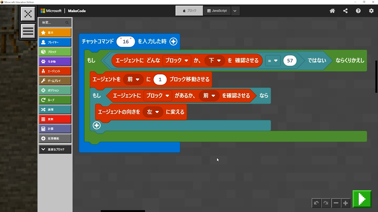 • 「エージェントにどんなブロックか下を確認させる」を入れないといけないのに、「エージェントにブロックがあるか下を確認させる」というプログラムを入れてしまっている。