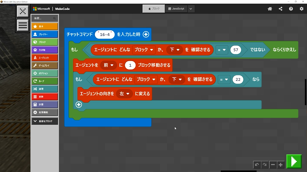 - 「エージェントにどんなブロックか下を確認させる」を入れないといけないのに、「エージェントにブロックがあるか下を確認させる」というプログラムを入れてしまっている。