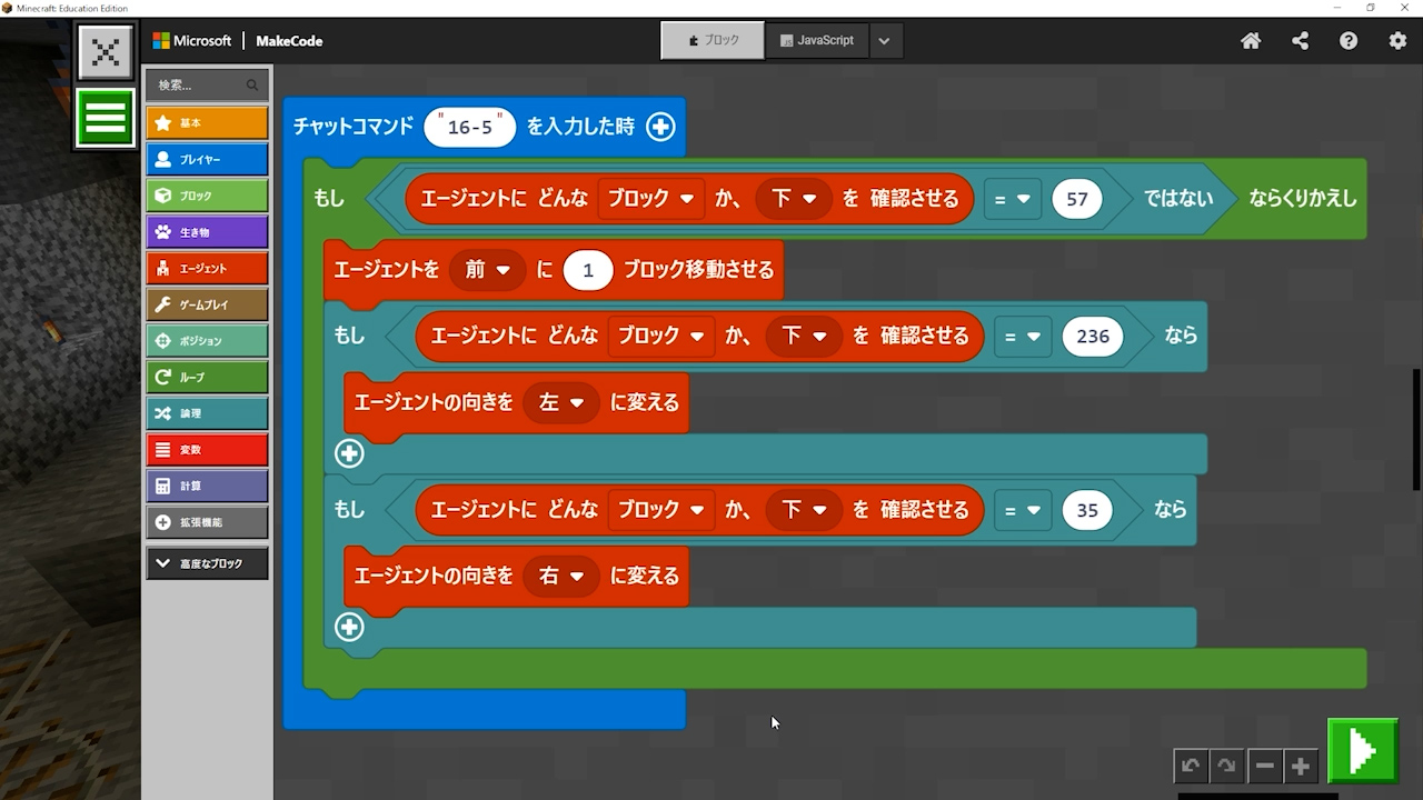 • 「エージェントにどんなブロックか下を確認させる」を入れないといけないのに、「エージェントにブロックがあるか下を確認させる」というプログラムを入れてしまっている。