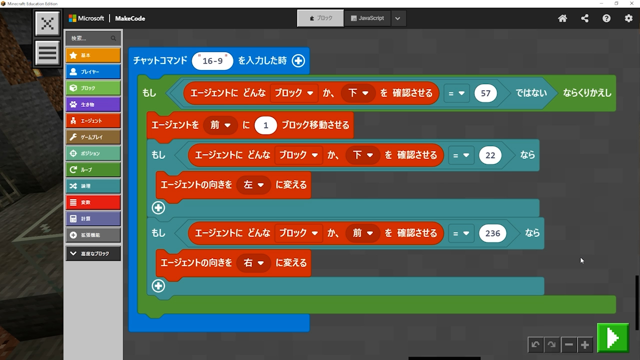 - 「エージェントにどんなブロックか下を確認させる」を入れないといけないのに、「エージェントにブロックがあるか下を確認させる」というプログラムを入れてしまっている。