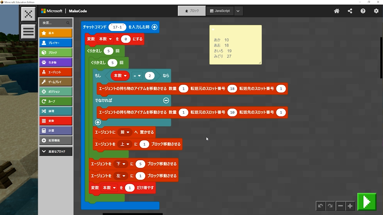 - エージェントのアイテム欄に注意! ブロックがなくなっていないか、減っていないかをよく確認する。