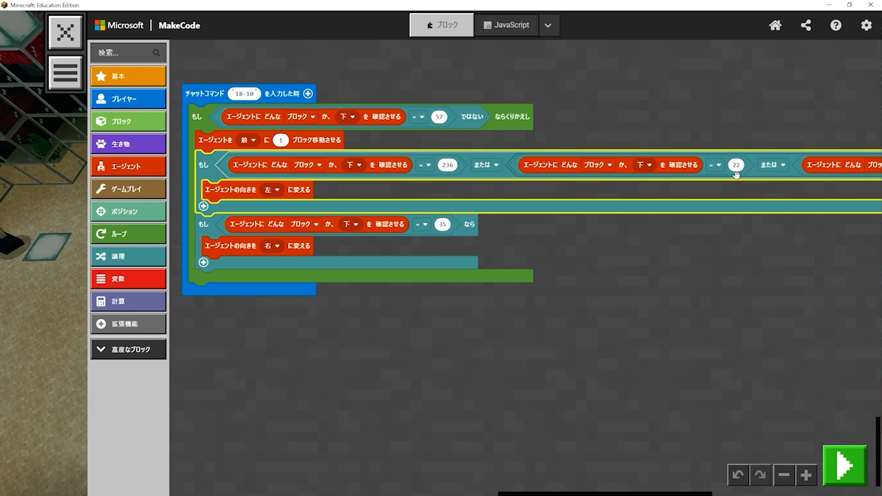 - 「エージェントにどんなブロックか下を確認させる」を入れないといけないのに、「エージェントにブロックがあるか下を確認させる」というプログラムを入れてしまっている。
