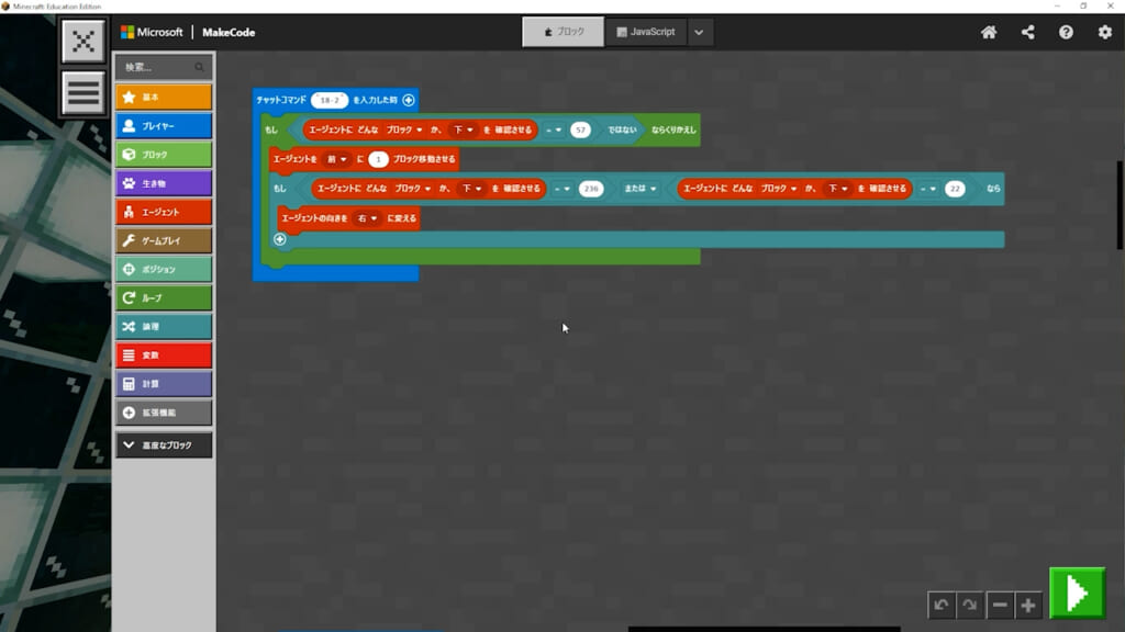 - 「エージェントにどんなブロックか下を確認させる」を入れないといけないのに、「エージェントにブロックがあるか下を確認させる」というプログラムを入れてしまっている。