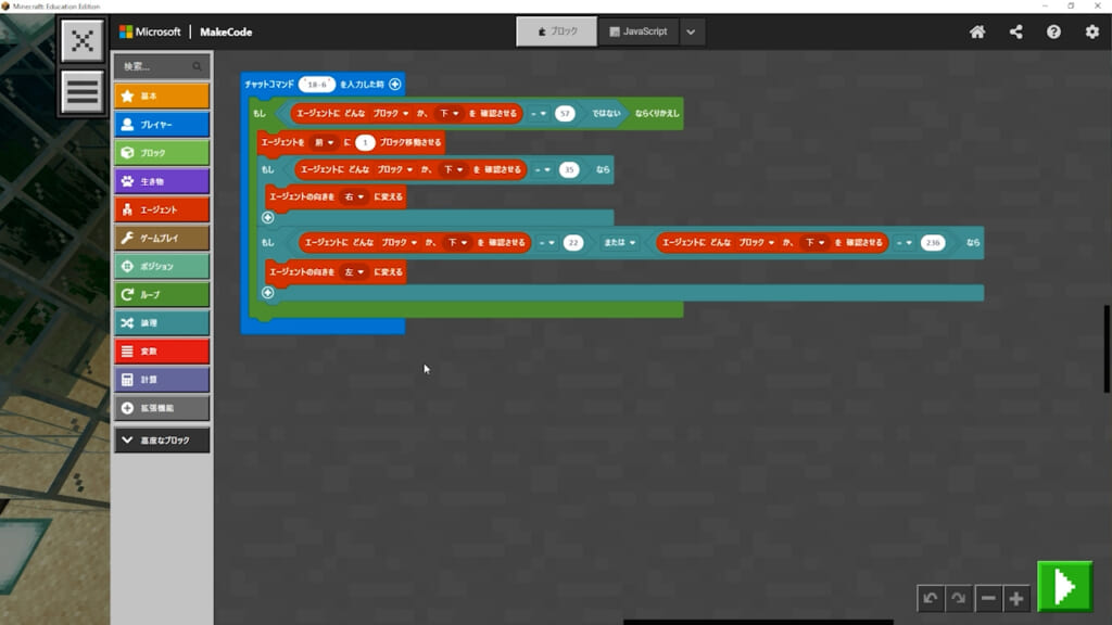 • 「エージェントにどんなブロックか下を確認させる」を入れないといけないのに、「エージェントにブロックがあるか下を確認させる」というプログラムを入れてしまっている。
