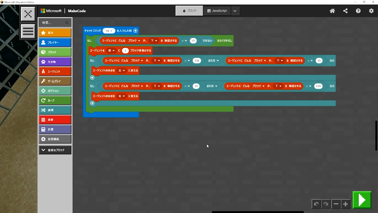 - 「エージェントにどんなブロックか下を確認させる」を入れないといけないのに、「エージェントにブロックがあるか下を確認させる」というプログラムを入れてしまっている。