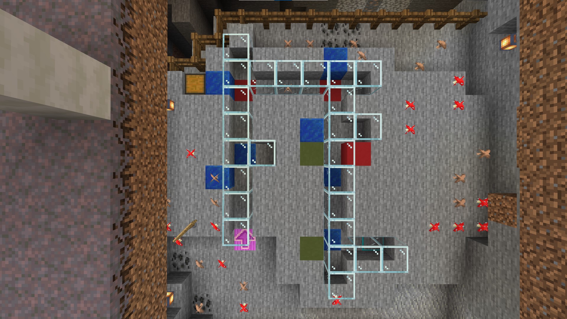 - 一番外側の「もし下のブロックがスイッチではないなら繰り返し」の中の一番上に入れないといけない「前に進む」が変な場所にある、もしくは存在しない。