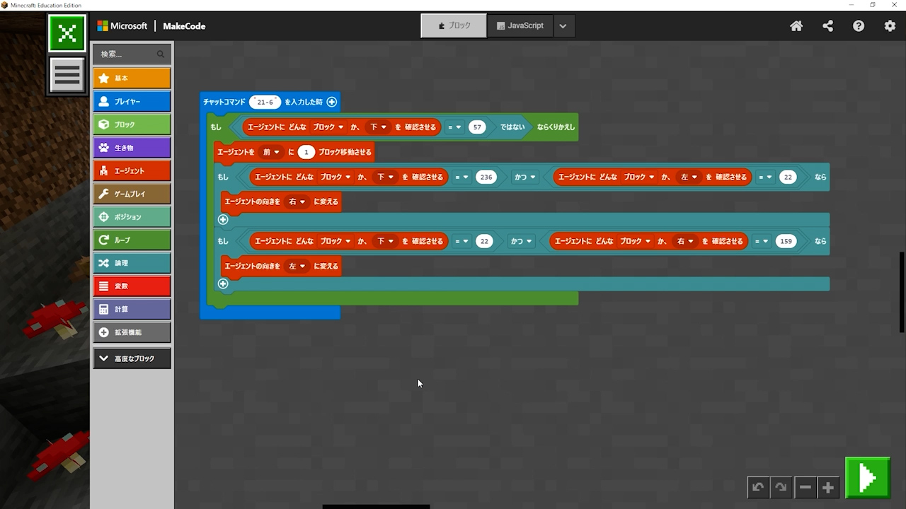 - 「エージェントにどんなブロックか下を確認させる」を入れないといけないのに、「エージェントにブロックがあるか下を確認させる」というプログラムを入れてしまっている。