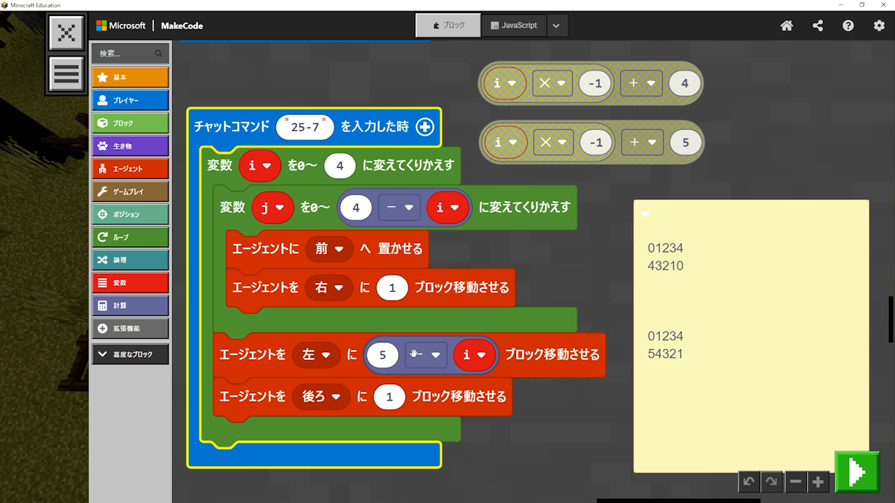- 例)右に行く繰り返しの式は「4 - i」だが左に進む数の式は「5 - i」になる(繰り返しは0からカウントするから)