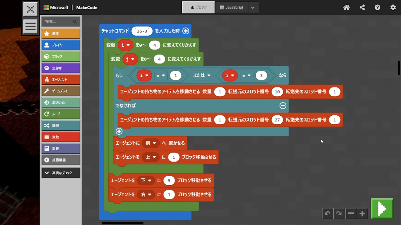 - エージェントのアイテム欄に注意! ブロックがなくなっていないか、減っていないかをよく確認する。