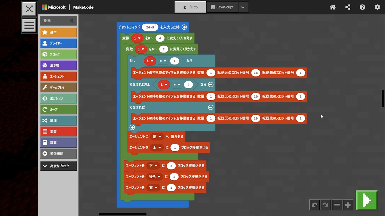 - エージェントのアイテム欄に注意! ブロックがなくなっていないか、減っていないかをよく確認する。