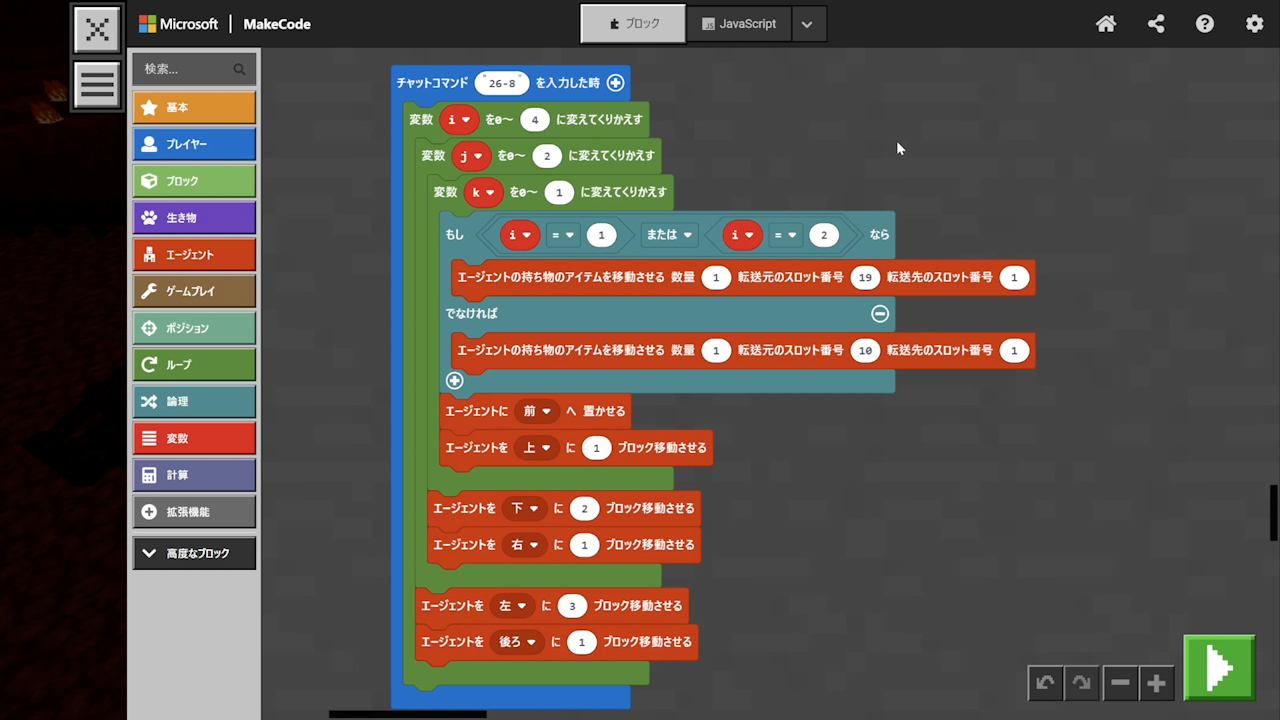 - エージェントのアイテム欄に注意! ブロックがなくなっていないか、減っていないかをよく確認する。