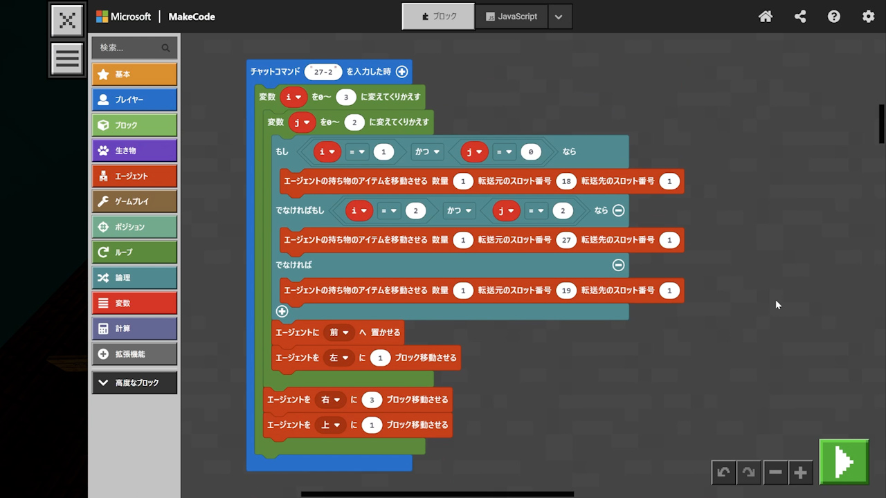 • エージェントのアイテム欄に注意! ブロックがなくなっていないか、減っていないかをよく確認する。