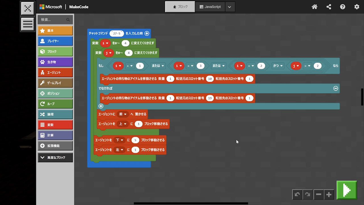- エージェントのアイテム欄に注意! ブロックがなくなっていないか、減っていないかをよく確認する。