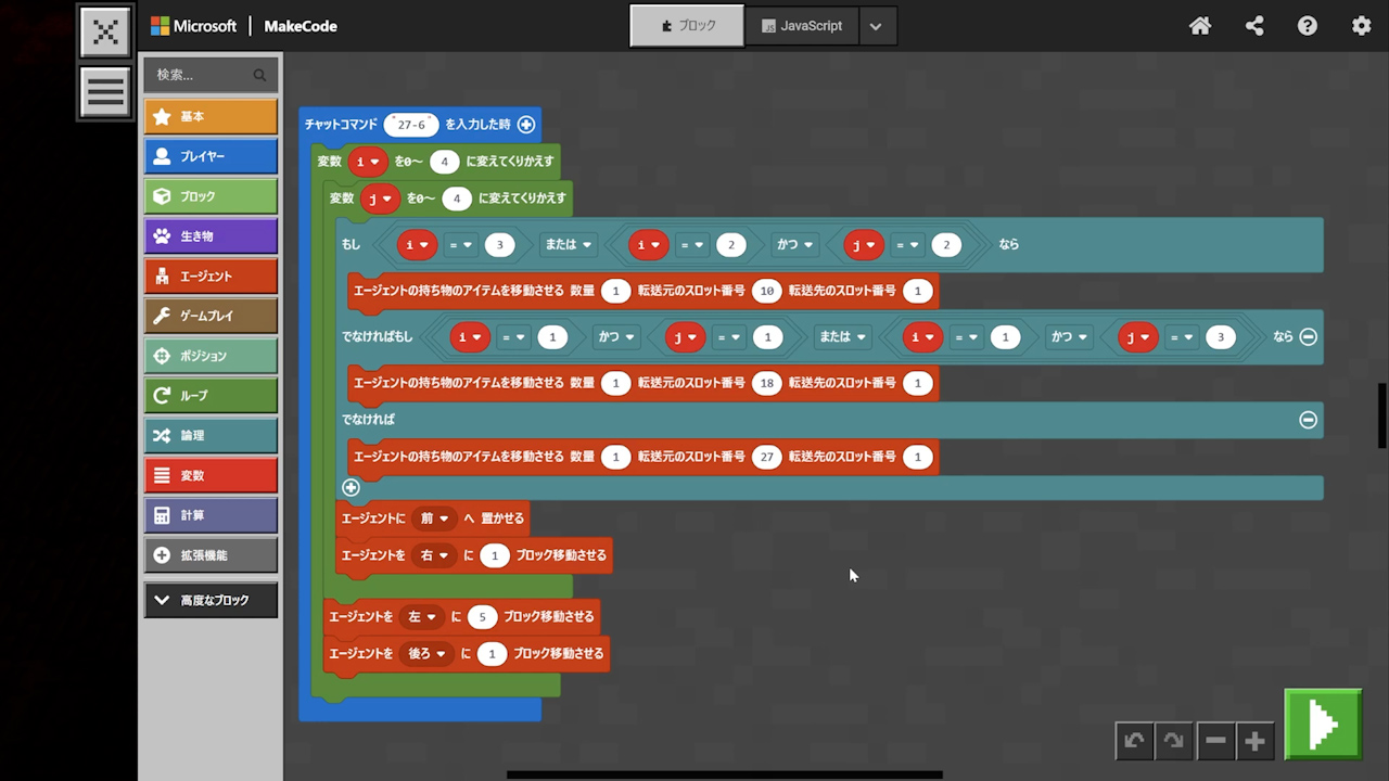 - エージェントのアイテム欄に注意! ブロックがなくなっていないか、減っていないかをよく確認する。