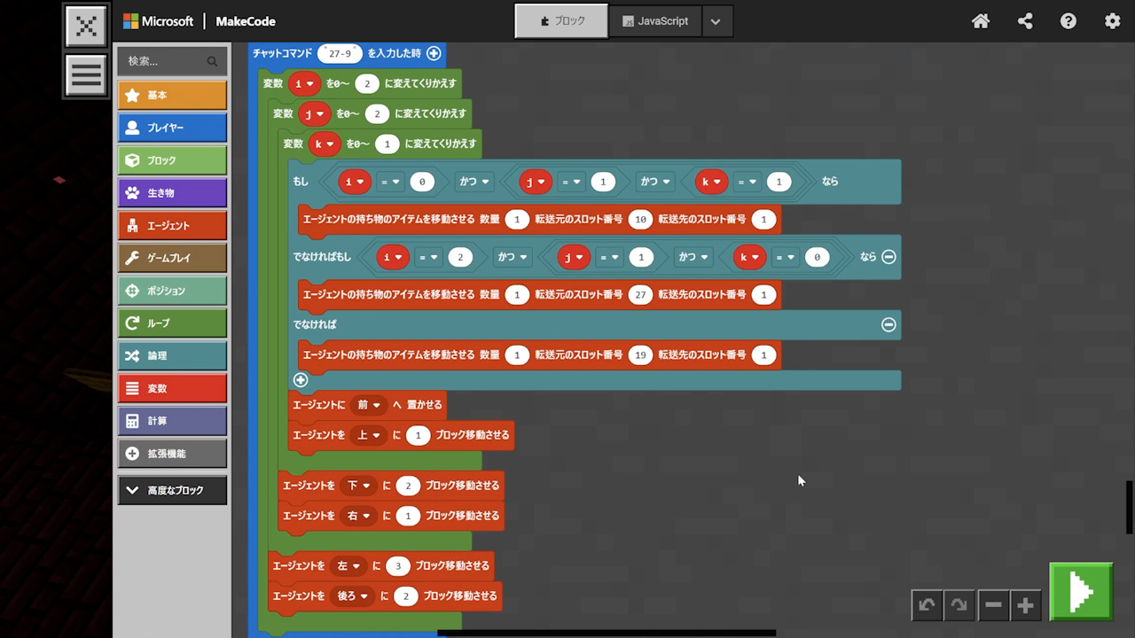 - エージェントのアイテム欄に注意! ブロックがなくなっていないか、減っていないかをよく確認する。