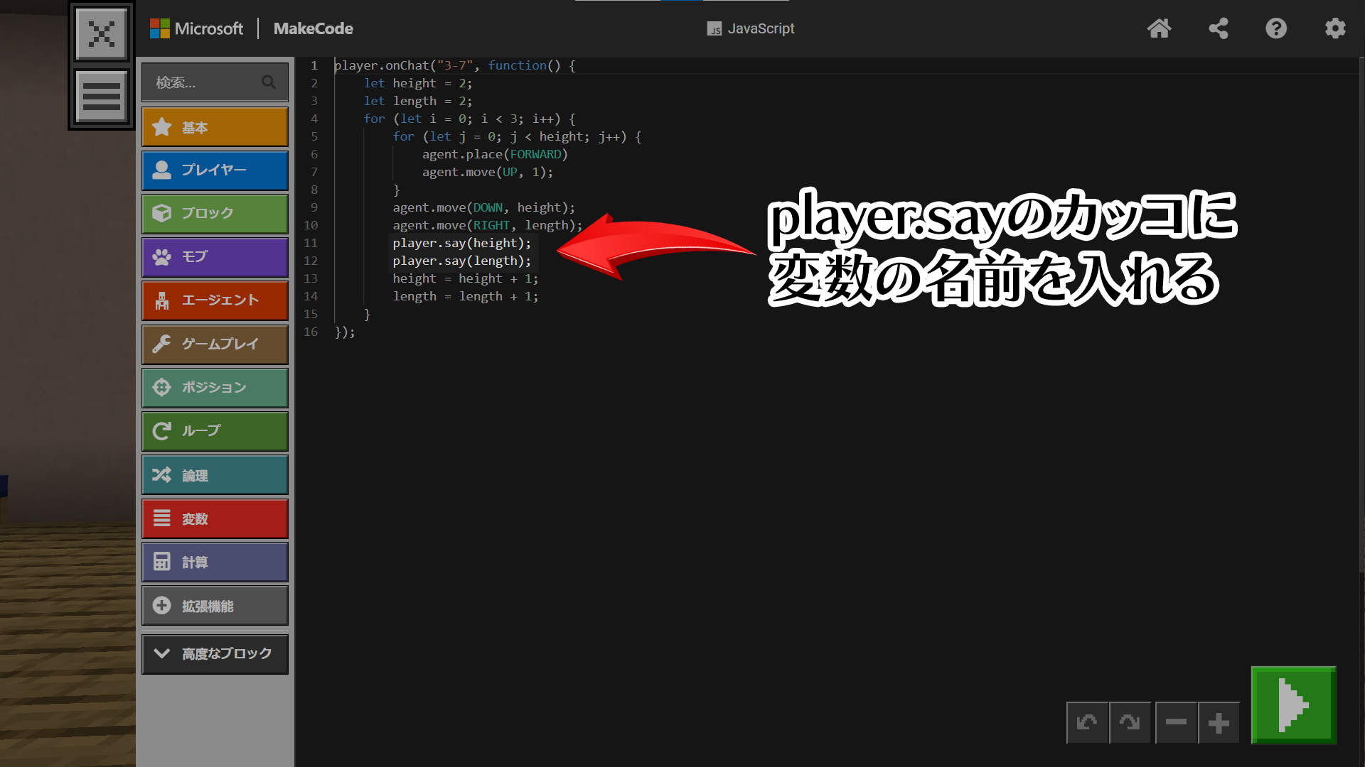 3-8 隣町を目指して③ 公開済み: 2023年5月16日更新: 2025年8月9日作成者: edmonstaff_admin 解説動画 解答画像 変数が変化しているか確認する方法 前の記事へ 3-7 隣町を目指して② 次の記事へ3-9 隣町を目指して④